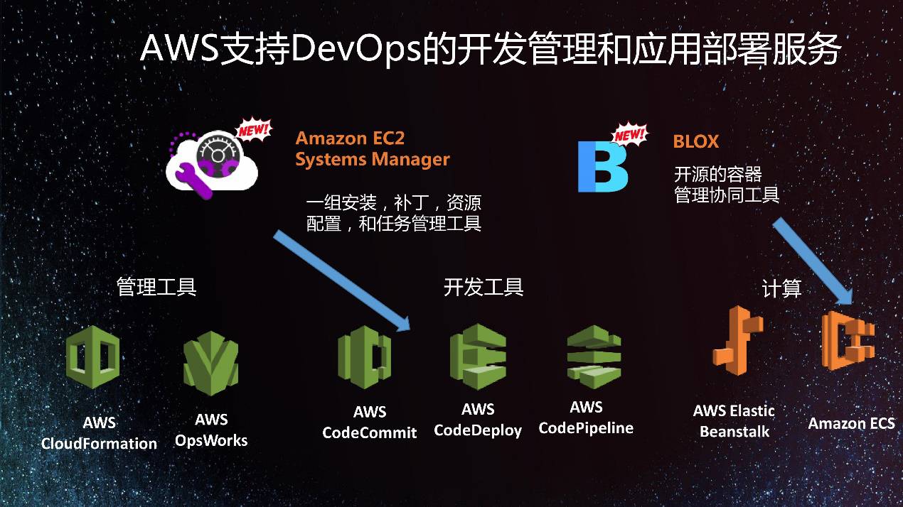 张侠表示,AWS一直得到大家喜欢最主要的原因是针对开发者的社区,提供了全方位的云的部署,从软件开发部署到容器管理等一系列的服务。众所周知,CloudFormation,整个亚马逊云服务器等所有的设施是通过一个文件,只要启动一个数据中心全部的设置就启动了。这类开发工具有很多功能,这次AWS又推出了更多新的功能:在OpsWorks上推出了For Chef Automate—自动托管服务器;推出了CodeBuide功能用来部署、开发CICD工具以及做代码翻译和单元测试;推出了EC2安装补丁、内部配置、安装管理工具;推出了容器管理和协同工具。