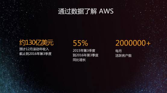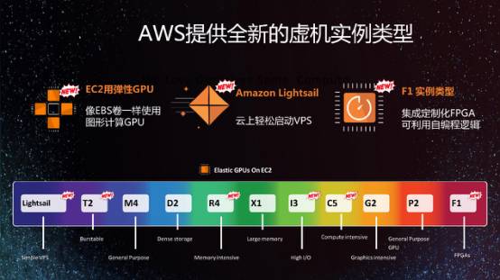 今年AWS推出了三个主要类型的全新虚机,第一个是GPU,传统的EC2虚机实例当做硬盘做弹性的GPU;第二个是Lightsail,云上能轻松启动VPS,这是亚马逊首次推出的云上启动VPS服务;第三个是F1实例类型,是一个专用的矩阵晶体管,可以把运算逻辑放在里面,使得整个计算CPU的效率提高了30倍。