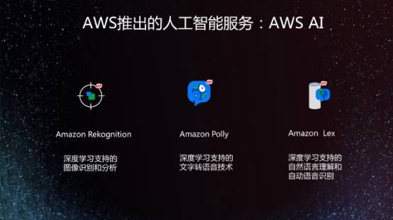 今年AWS还推出了三个基于深度学习的人工智能服务:第一个是图象识别技术Rekognition,能够识别图像里物品,也能识别人、人的性别、年龄和情绪等;第二个是深度学习支持的文字转语音技术Polly,把24种语言的文字用类似人的读音直接发出声音;第三个是深度学习支持的自然语言理解和自动语音识别Lex,是语音互动的核心。